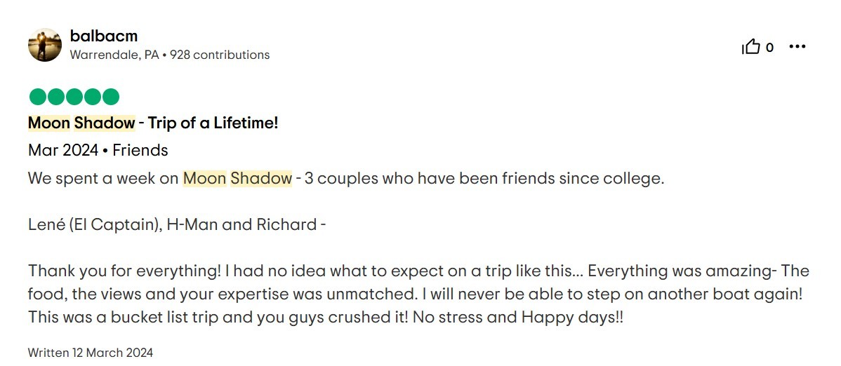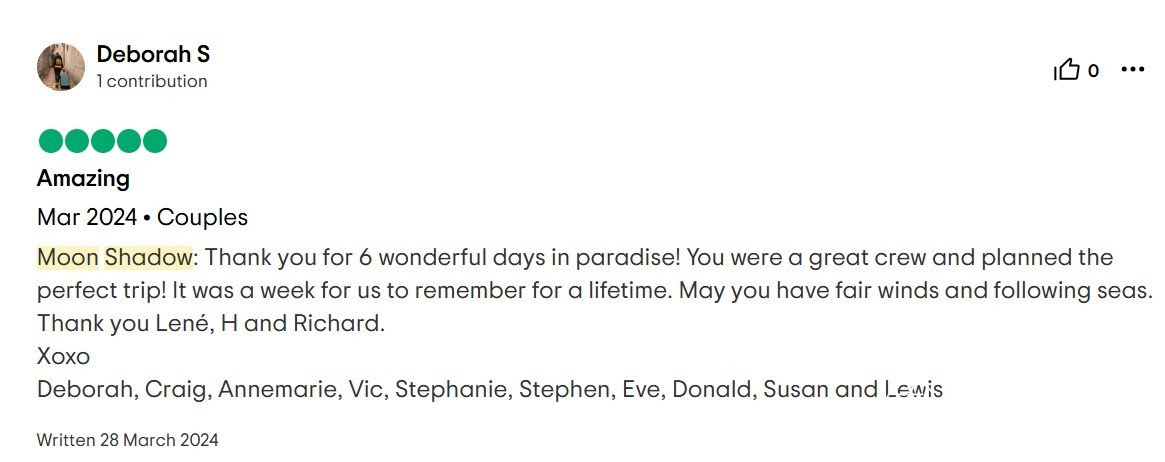 Moon Shadow: Thank you for 6 wonderful days in paradise! You were a great crew and planned the perfect trip! It was a week for us to remember for a lifetime. May you have fair winds and following seas. Thank you Lené, H and Richard.