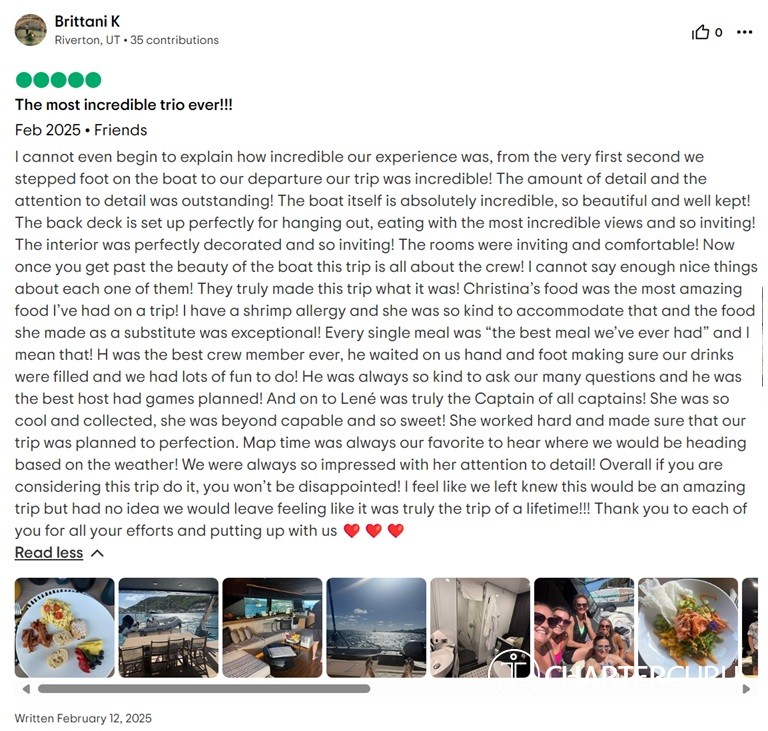 We just returned from a one week charter on the MOON Shadow. Our amazing crew Captain Lene, First Mate H, and Chef Christina went above and beyond with every detail to create an unforgettable experience for our week. The boat is spectacular - from the top deck with sweeping views while sailing to the dining table overlooking the water. Each space was comfortable, spotless, and simply delightful. We were treated like royalty with gourmet meals paired with craft cocktails each day. We sailed to gorgeous places and always, first and foremost, felt safe. Our trip was customized and curated to exceed all expectations. We cannot express enough gratitude to our crew for taking moments and making memories. A true bucket list trip with dear friends.