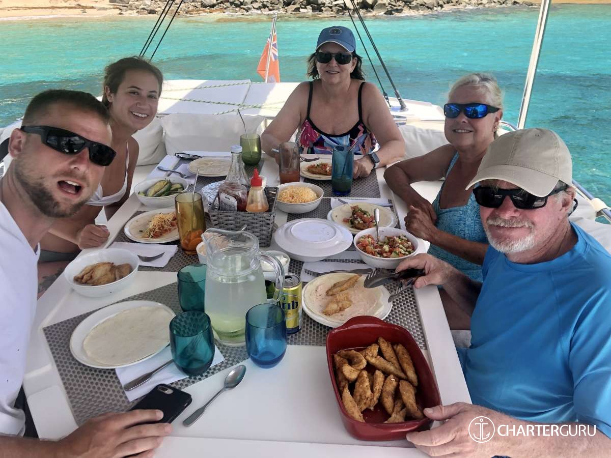 LOCAL FARE: Includes: 7 breakfasts, 5 lunches & 5 dinners. Requires 2 lunches and 2 dinners ashore at client expense. -For local fare, deduct $150 per person off the charter rate
