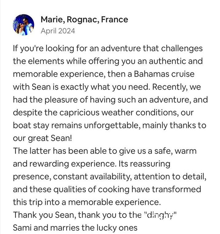 If you're looking for an adventure that challenges the elements while offering you an authentic and memorable experience, then a Bahamas cruise with Sean is exactly what you need. Recently, we had the pleasure of having such an adventure, and despite the capricious weather conditions, our boat stay remains unforgettable, mainly thanks to our great Sean!
