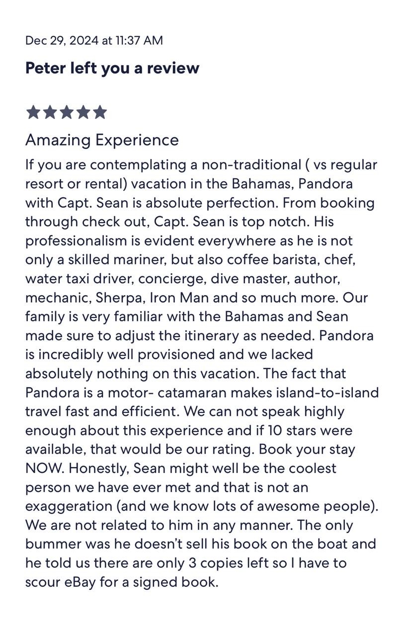 If you are contemplating a non-traditional (vs regular resort or rental) vacation in the Bahamas, Pandora with Capt. Sean is absolute perfection. From booking through check out, Capt. Sean is top notch. His professionalism is evident everywhere as he is not only a skilled mariner, but also coffee barista, chef, water taxi driver, concierge, dive master, author, mechanic, Sherpa, Iron Man and so much more. Our family is very familiar with the Bahamas and Sean made sure to adjust the itinerary as needed. Pandora is incredibly well provisioned and we lacked absolutely nothing on this vacation. The fact that Pandora is a motor- catamaran makes island-to-island travel fast and efficient. We can not speak highly enough about this experience and if 10 stars were available, that would be our rating. Book your stay NOW. Honestly, Sean might well be the coolest person we have ever met and that is not an exaggeration (and we know lots of awesome people).