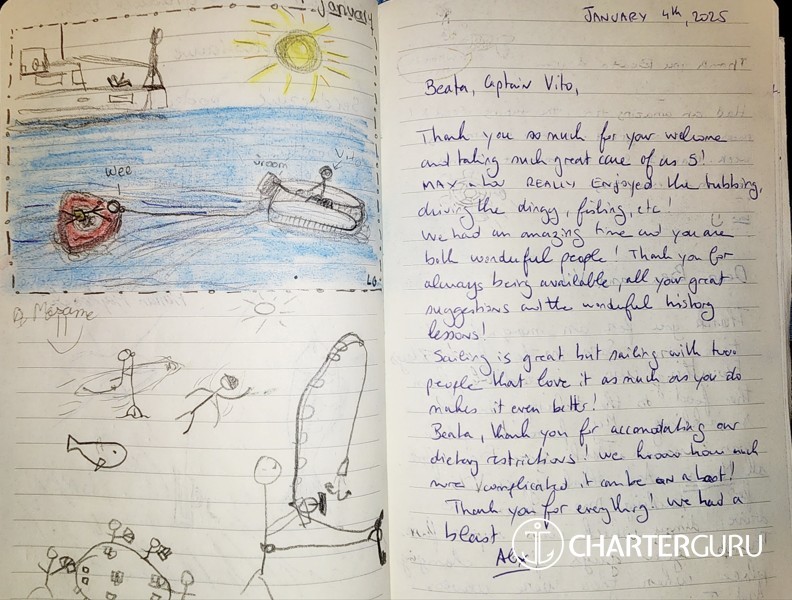 It was interesting to be on a boat which serves as the home of the crew. Hearing their stories about their travels was also interesting. All in all, a truly fantastic holiday. We would highly recommend chartering with Sara.