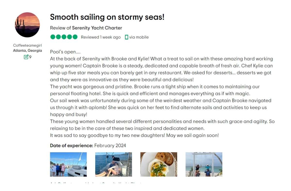 The yacht was gorgeous and pristine. Brooke runs a tight ship when it comes to maintaining our personal floating hotel. She is quick and efficient and manages everything as if with magic.