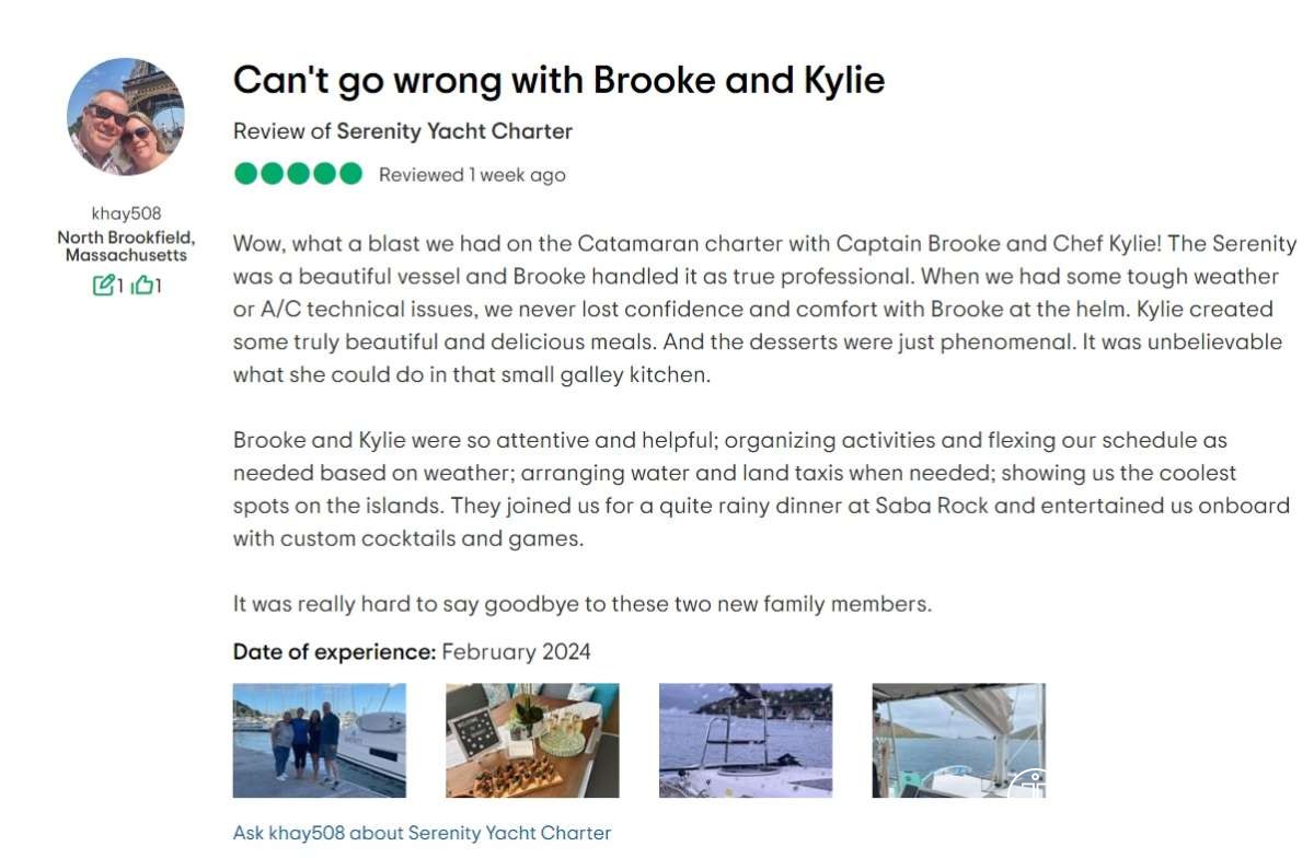 Brooke and Kylie were so attentive and helpful; organizing activities and flexing our schedule as needed based on weather; arranging water and land taxis when needed; showing us the coolest spots on the islands. They joined us for a quite rainy dinner at Saba Rock and entertained us onboard with custom cocktails and games.