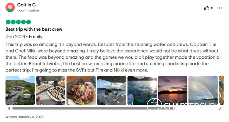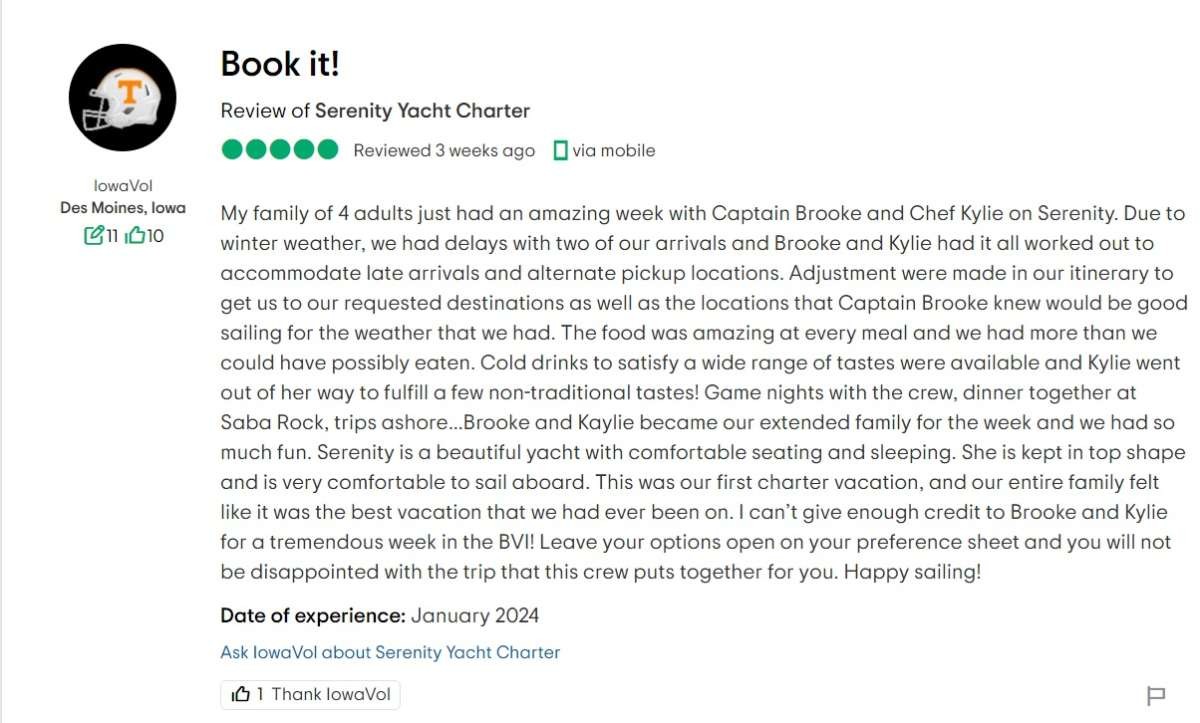 On top of these two being an amazing, TOP notch crew, they are two of the most lovely people we have ever had the pleasure to meet. Sharing a boat is a special, intimate experience and when we left, we all felt as if we were leaving family members behind. As a group, we laughed, played games at night, and enjoyed every bit of their company. We LOVED Serenity, we LOVED exploring the BVI, but our trip was MADE by this wonderful couple. We are already planning how we can sail with them again…and raving about them to anyone who asks. They are more than the ultimate professionals—they are two of the most special people we have had the privilege to spend time with. Anyone who is lucky enough to sail with them will be more than impressed.