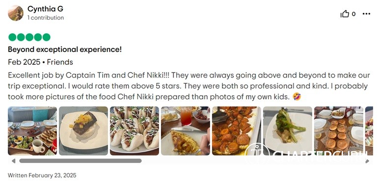 Nikki……was the cherry on top. The meals were beyond amazing. She opened her heart to our 4 year old and bonded with our children. We woke up to healthy and delicious meals. And we finished the day with a spectacular dinner and desert. She also made us feel so warm and welcome. We instantly felt like our experience was going to be special the moment we came aboard and she greeted us with warmth and laughter.
