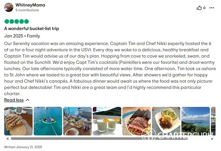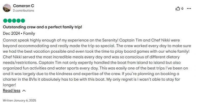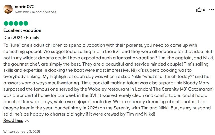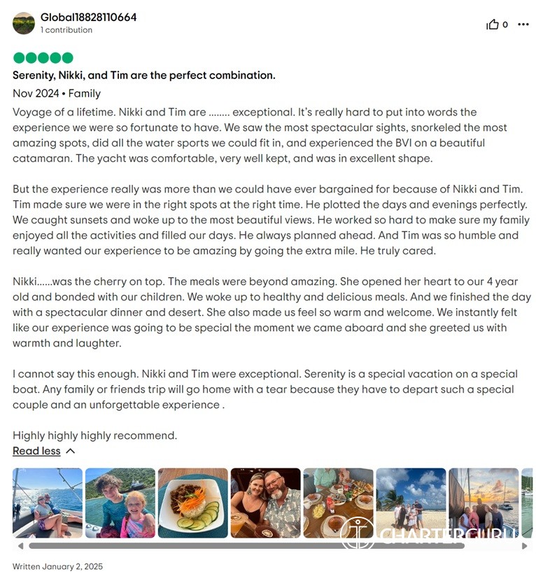 I cannot say this enough. Nikki and Tim were exceptional. Serenity is a special vacation on a special boat. Any family or friends trip will go home with a tear because they have to depart such a special couple and an unforgettable experience .