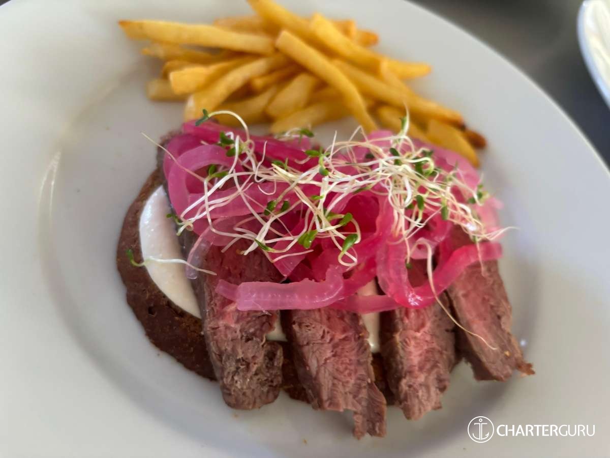 Half Board Option: Includes 7 breakfasts, 4 lunches & 3 dinners. Requires 3 lunches & 4 dinners ashore at client expense. Deduct $150/per person from the all-inclusive charter rate for half board.