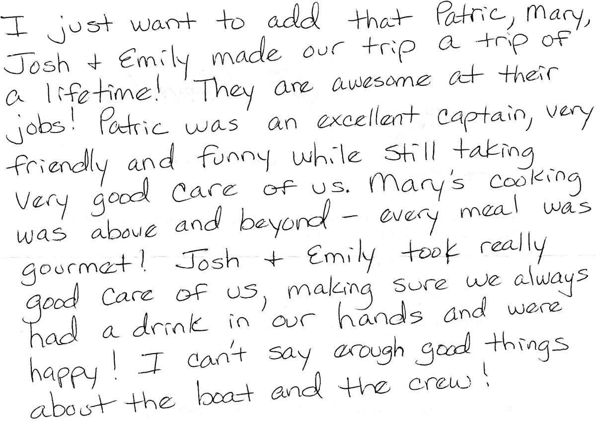 You have treated my family to the best vacation of our lives. As I look out into the bay on our last evening, I can say with certainty that the crews of the many vessels anchored could never compare to the professional service that you have provided.