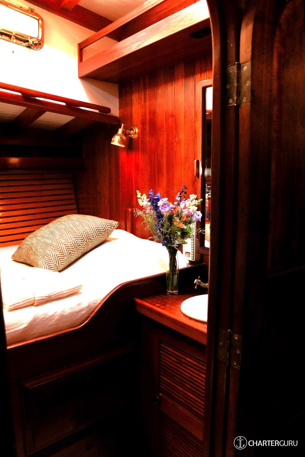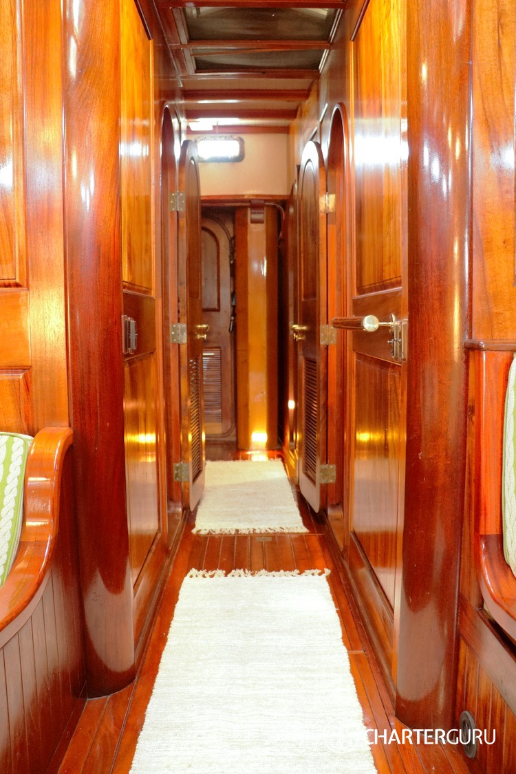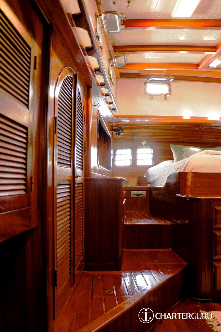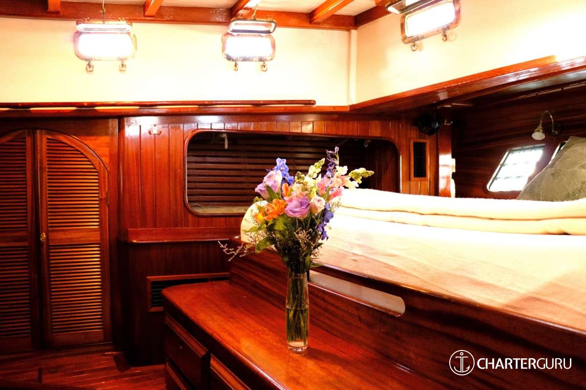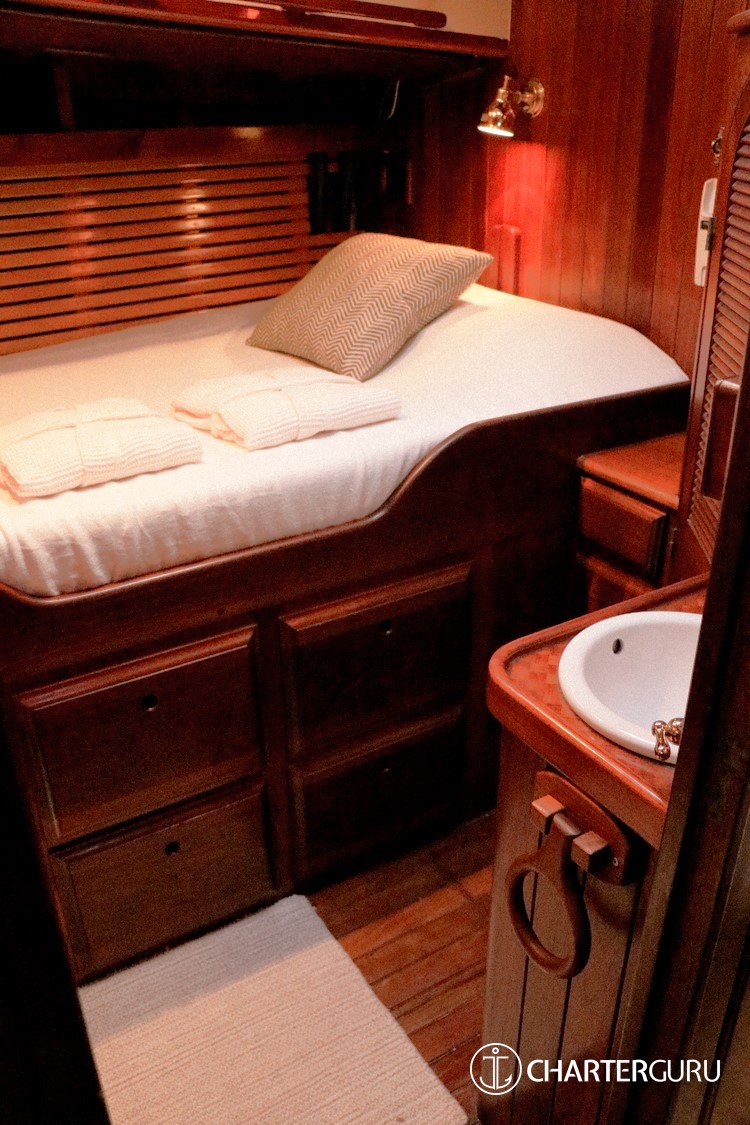 Accommodations: SY Tree of Life Sleeps 6 guests in 3 cabins:1 Master suite: The Master suite is placed in the stern and provides its occupants with a King bed, plenty of wardrobe space. The King size bed that can be split down the middle for two singles, and an en-suite bathroom with a sink, toilet and shower.