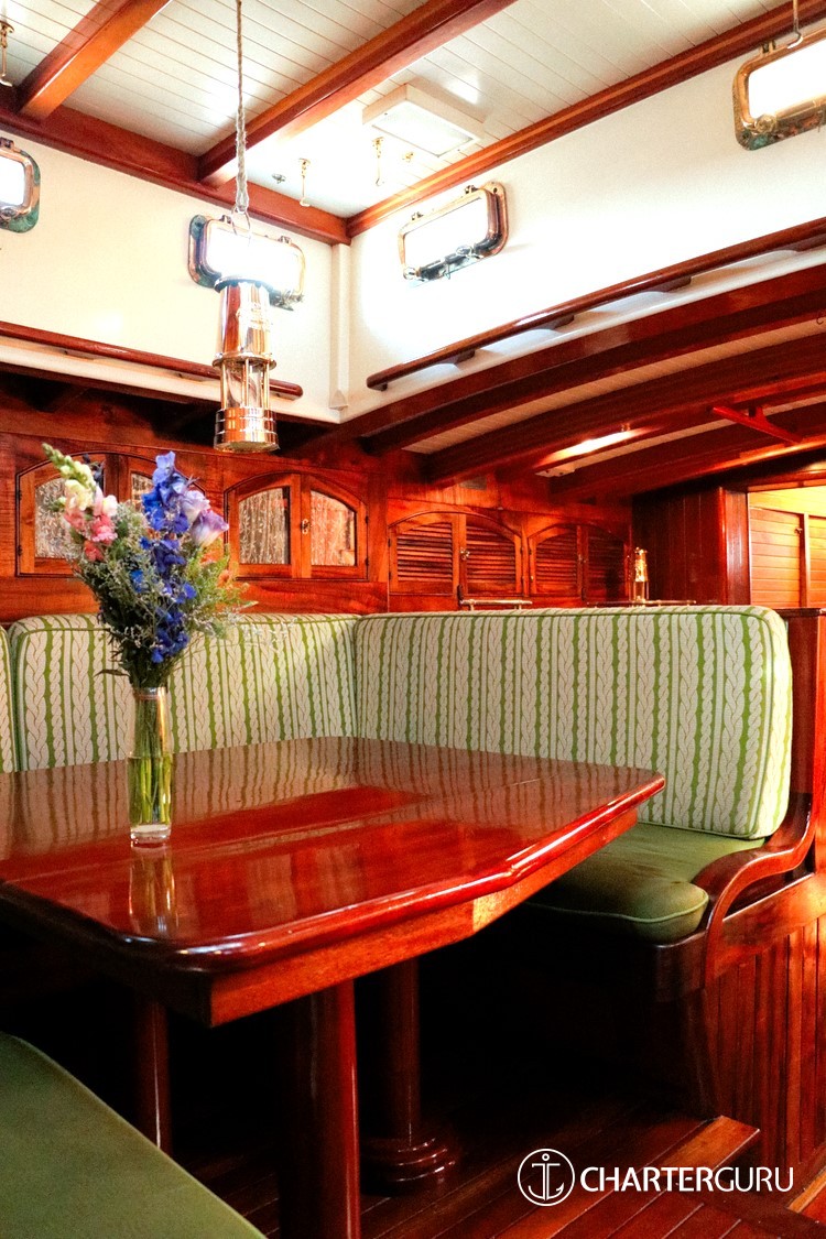 The two brand new Douglas fir Masts are impressive, with all new leatherwork, and attention to detail is everywhere, from luxurious bathrobes in each cabin, hand crafted flower vases to replace the outdated 'phone cubbies' previously in place (with fresh flowers always aboard), and brass lanterns hung on deck each evening.