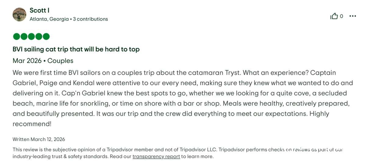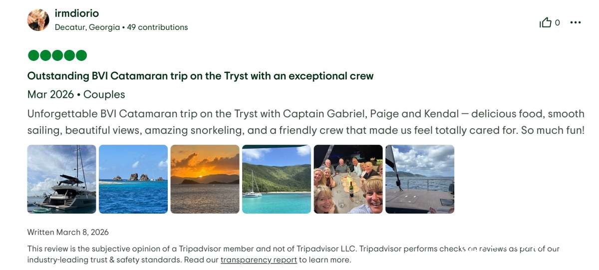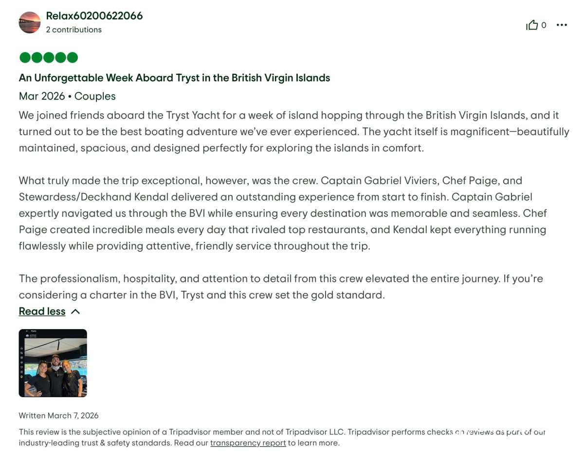 The professionalism, hospitality, and attention to detail from this crew elevated the entire journey. If you're considering a charter in the BVI, Tryst and this crew set the gold standard.