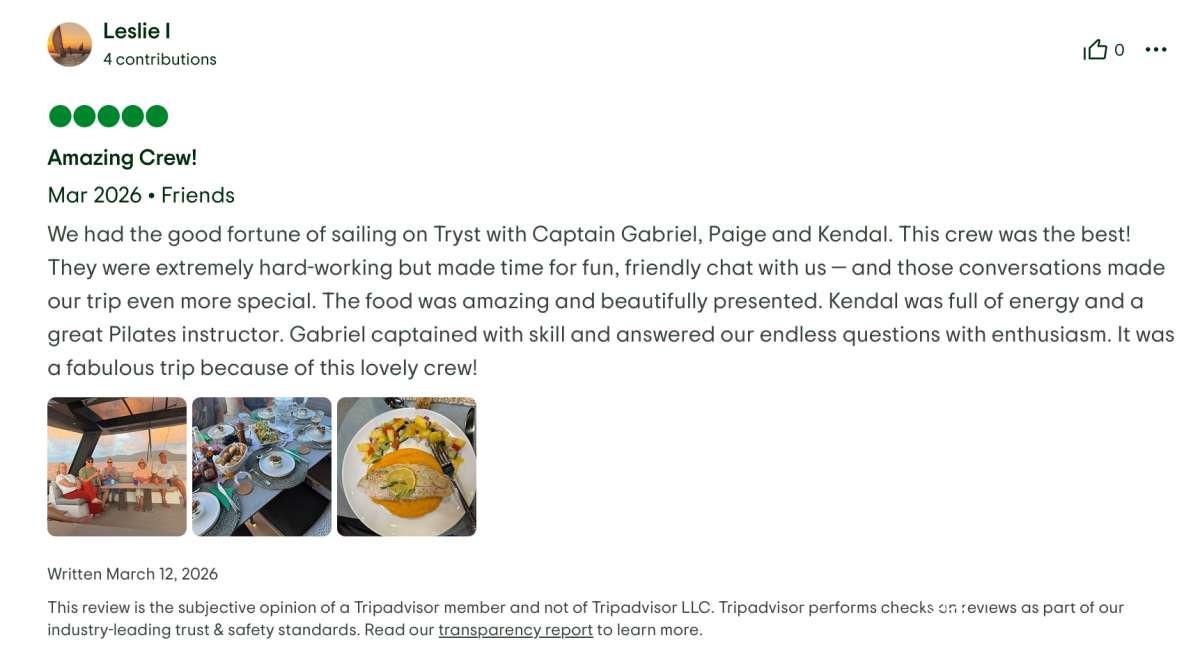 "Tryst". Captain Gabriel, Chef Paige, and First Mate Kendall were fantastic! Sailing to Anegada for lobster, great beaches, snorkeling, boat water toys, and The Bath's all made it a great time. Gabriel provided a great itinerary, Paige prepared unbelievably great meals, and Kendall made great cocktails, led fun morning exercise classes on the bow, and provided relaxing massages. The catamaran was very nice with plenty of room for a group of 8-10 guests. All in all it was a great vacation. Highly recommend the Tryst and the crew.