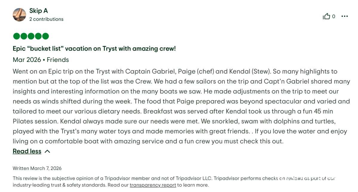 The crew - Riel, Paige and Kendall - were the absolute best!! The crew made the trip special in every possible way from great captaining and getting us to amazing coves, to unbelievable food, and to the most memorable massages ever!! I cannot rate them more highly!! We will be back!!