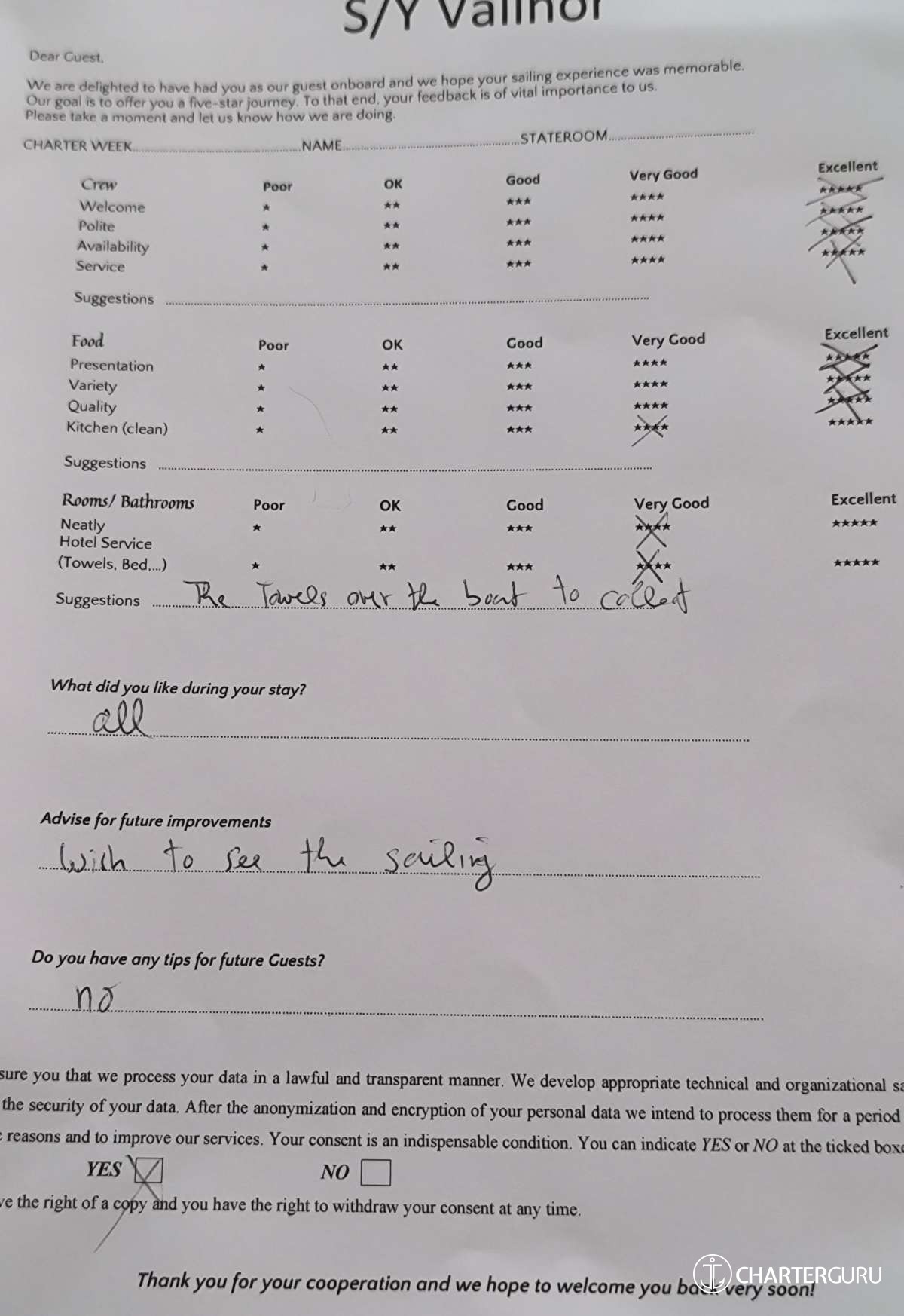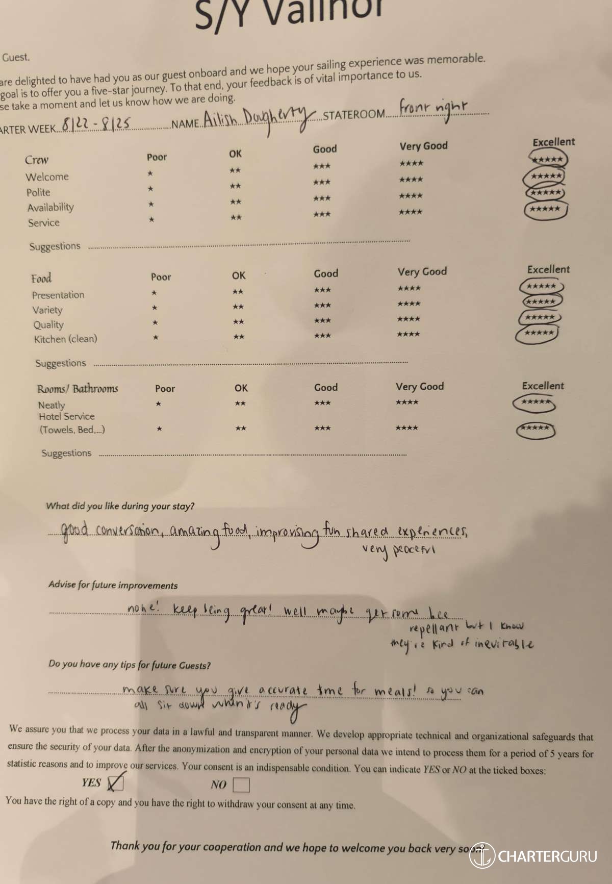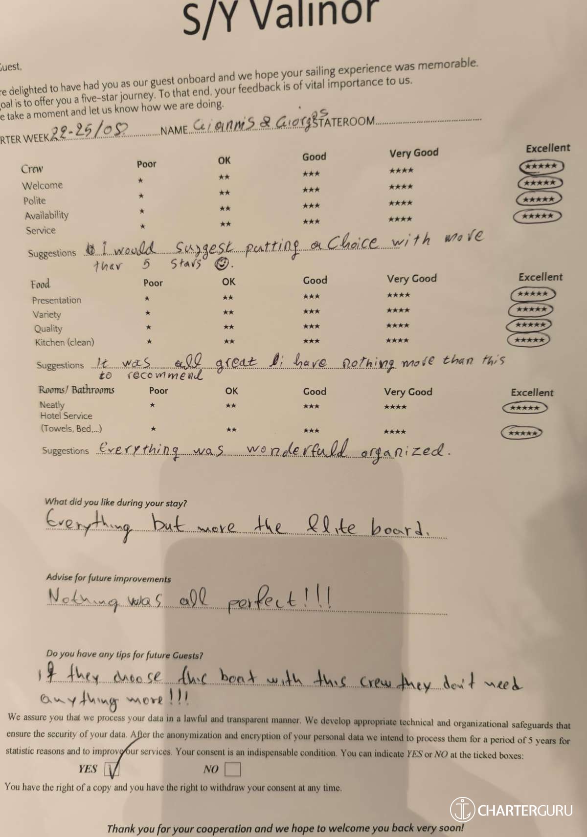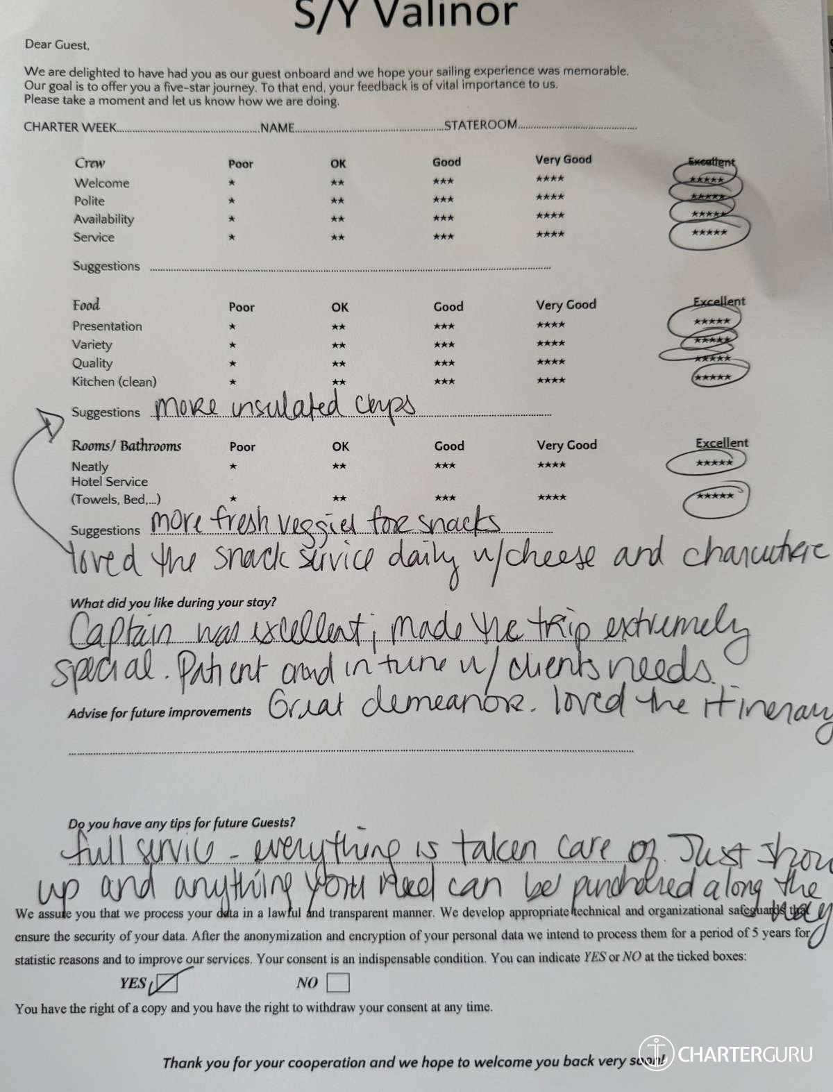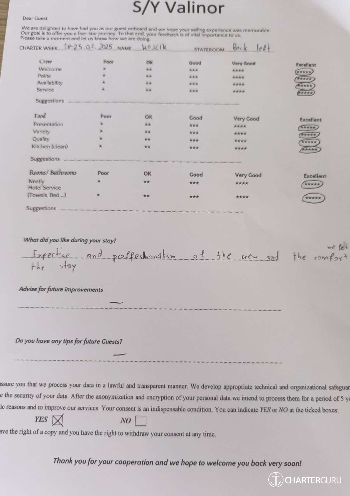 Fluent in five languages, they cater to an international clientele with ease, ensuring that communication is seamless and guests feel at home. Their expertise and hospitality are the cornerstone of the Valinor experience. While Valinor operates with just two crew members, we assure you that our service level matches that of a three-member crew. This setup is our personal preference to ensure a more intimate and less crowded environment for our guests with a 5-star service that exceeds expectations!