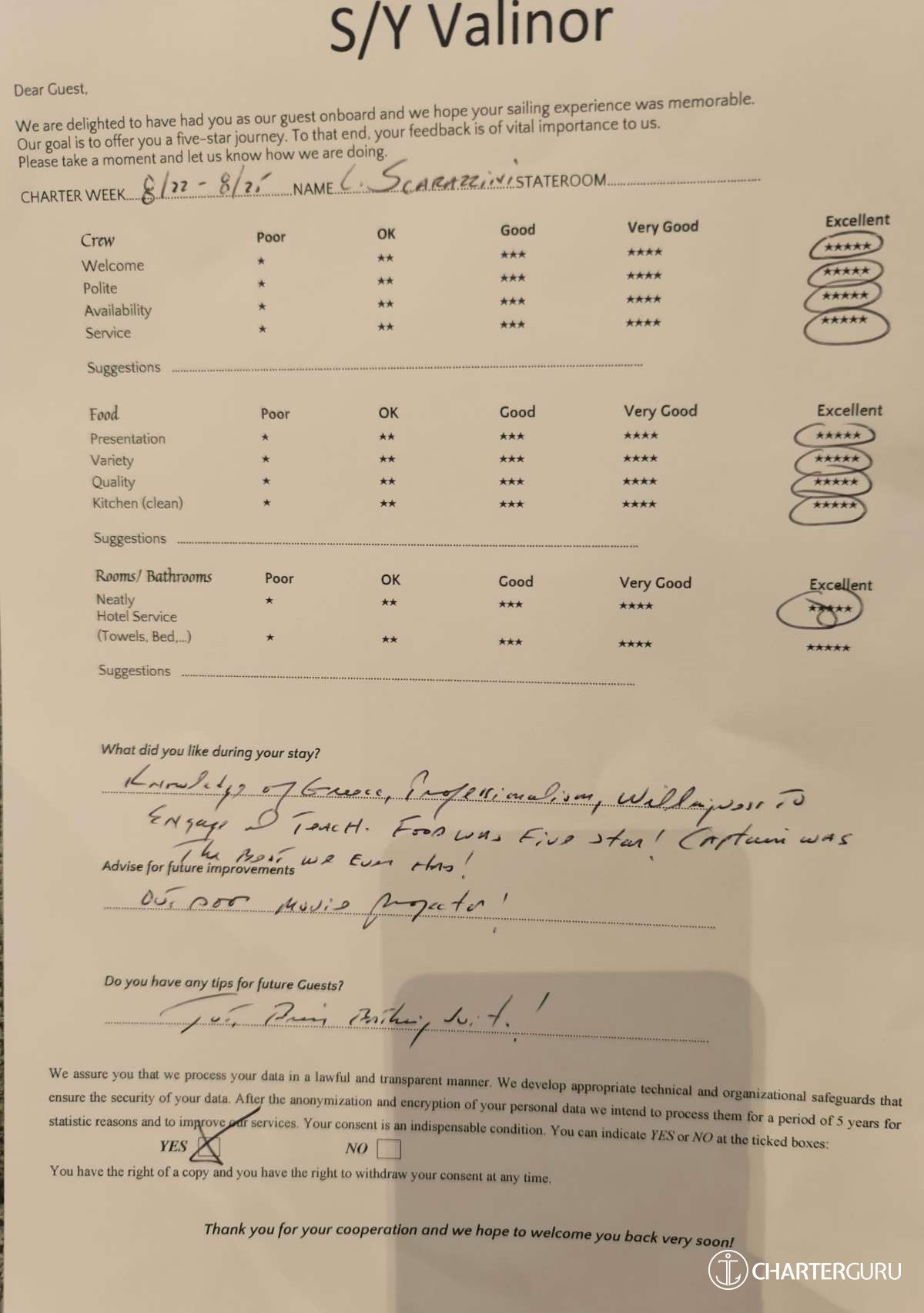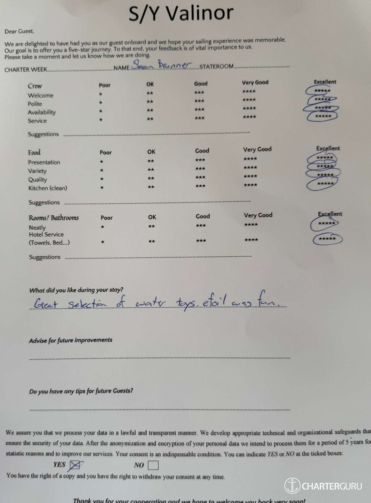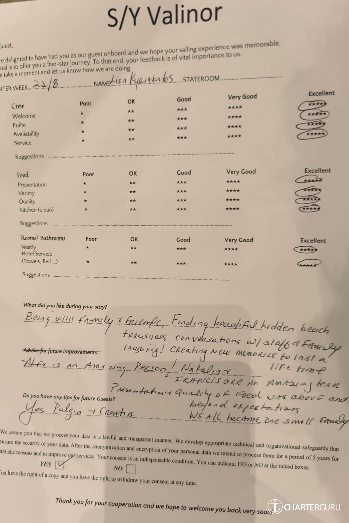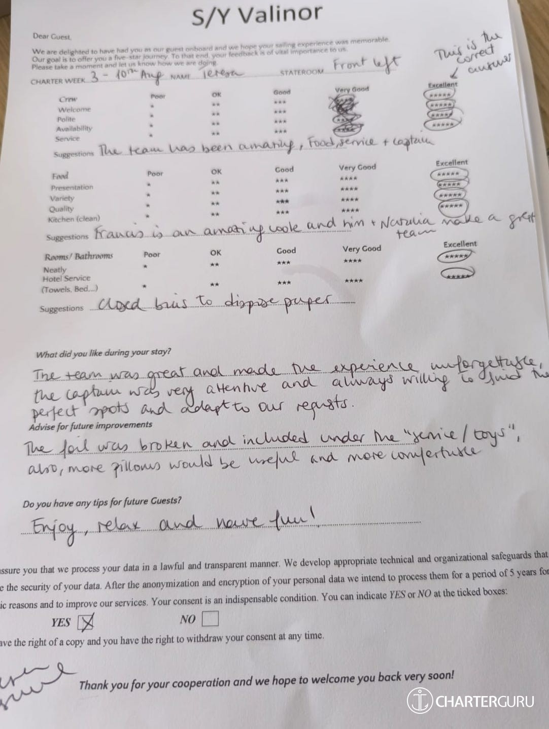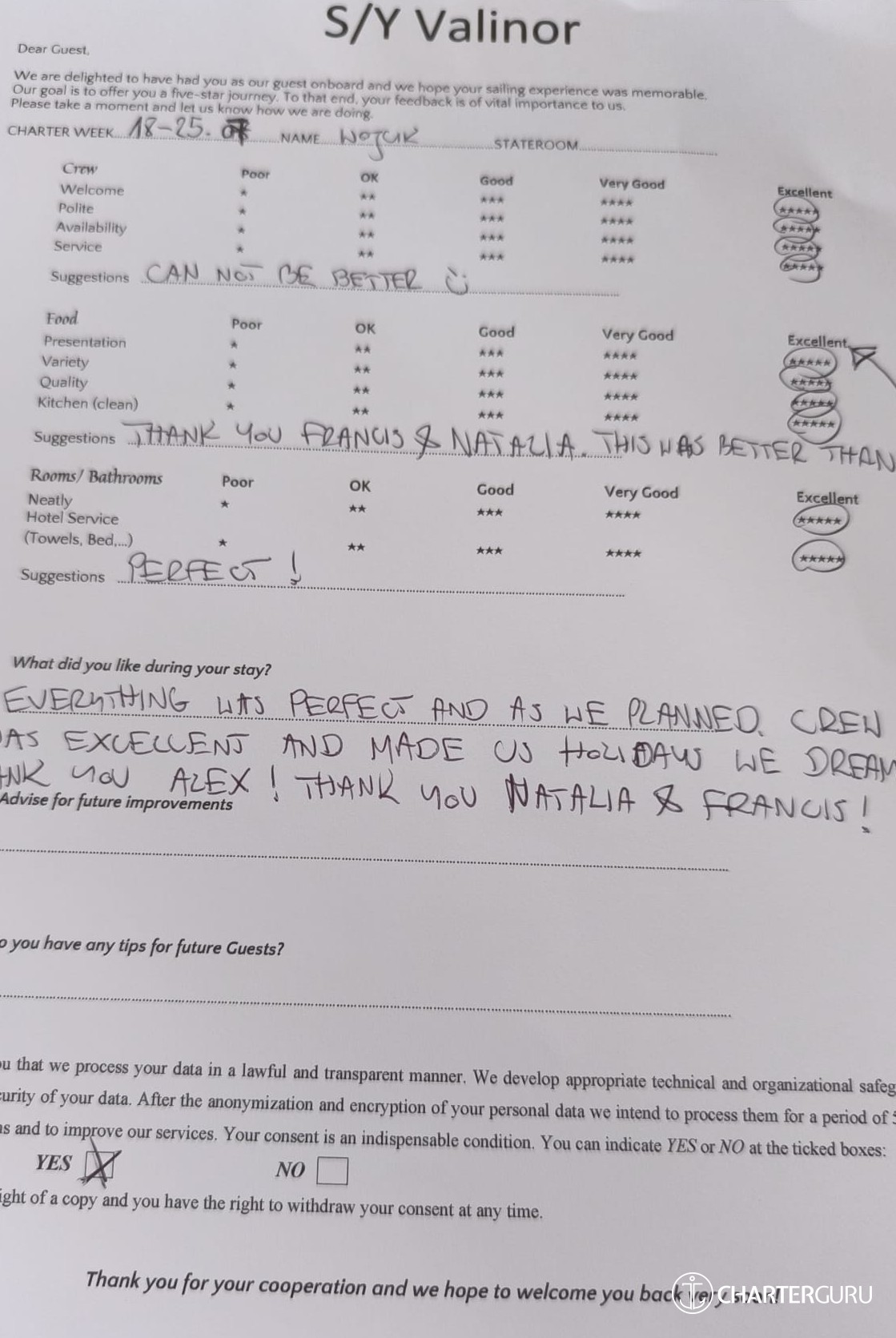 Fluent in five languages, they cater to an international clientele with ease, ensuring that communication is seamless and guests feel at home. Their expertise and hospitality are the cornerstone of the Valinor experience. While Valinor operates with just two crew members, we assure you that our service level matches that of a three-member crew. This setup is our personal preference to ensure a more intimate and less crowded environment for our guests with a 5-star service that exceeds expectations!
