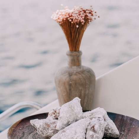 Boarding after 4PM, welcome cocktails, then dinner to be taken ashore at client expense. Includes breakfast the next morning. Sleep aboard may be on a mooring.