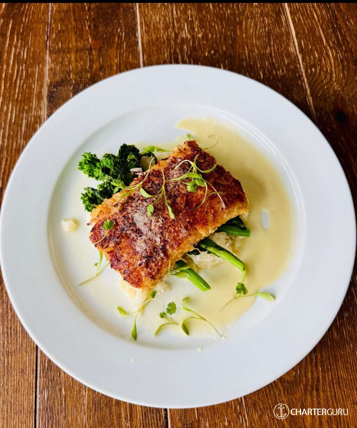 Julie’s culinary style is elegant yet approachable — effortlessly blending vibrant flavors, colorful presentation, and guest preferences into beautifully balanced meals. From island-inspired lunches and bright, wholesome breakfast bowls to romantic dinners under the stars, her menus are tailored to suit the rhythm of each day on board. Guests often rave about her creative flair, light touch, and ability to make each meal feel like a moment worth savoring.