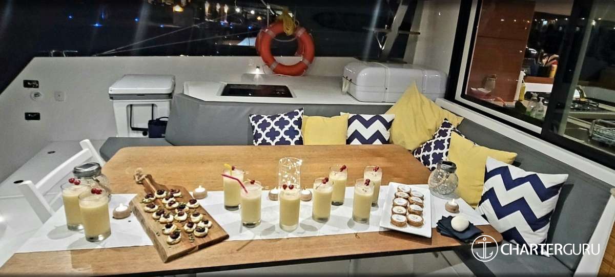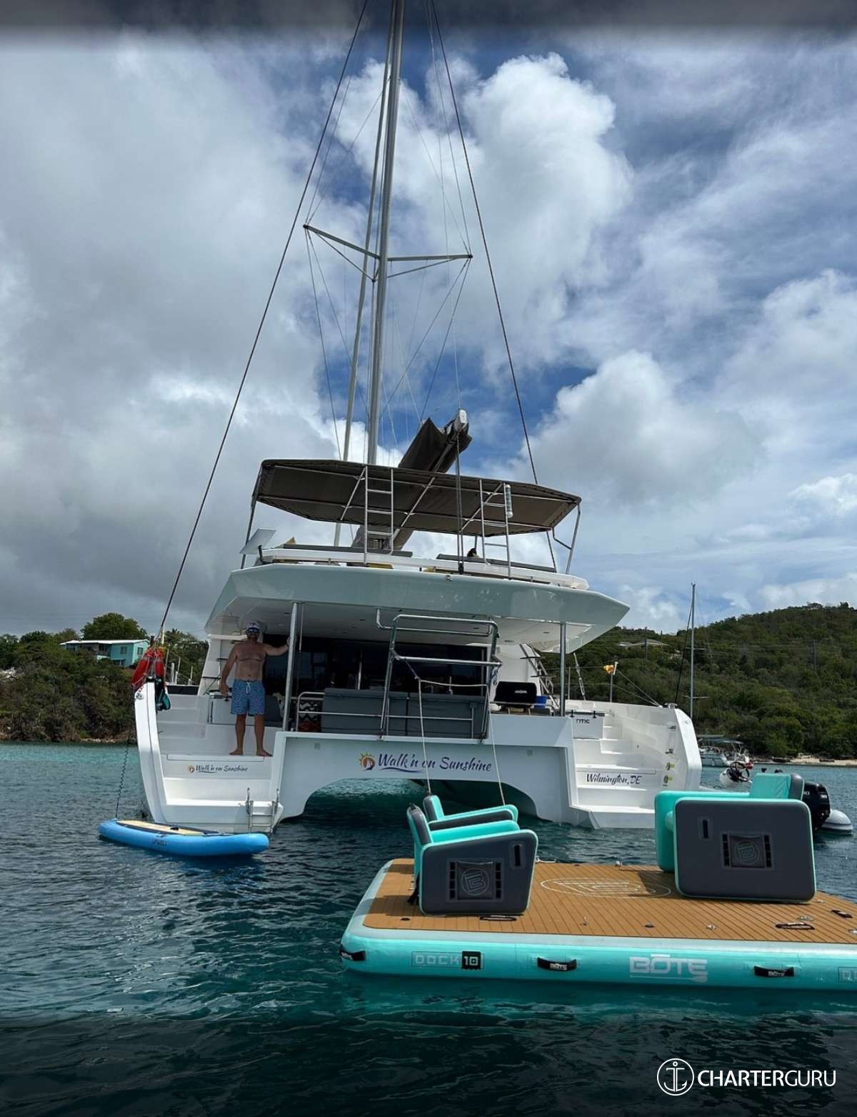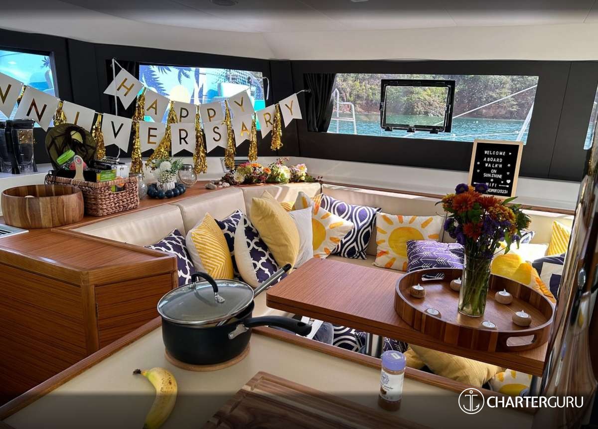 WALK’N ON SUNSHINE is offered primarily as a sailing catamaran. The yacht layout radiates from the main saloon, which connects to the aft deck. The aft deck features a variety of seating areas and that's where most of the meals are served. The modern cabins are located in the 2 massive hulls. The cabins offer unbeatable views in the morning and are located just below deck. Multiple portholes offer desirable views, while providing privacy if needed.