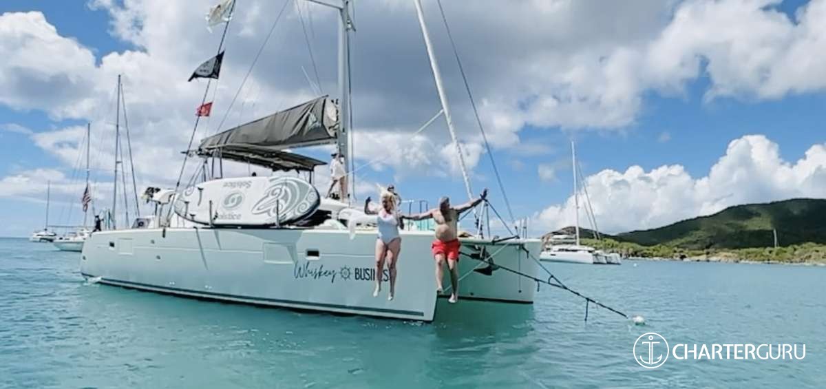 Whiskey Business is a beautiful 45' Lagoon Catamaran with 3 queen cabins each with private ensuite baths including electric heads, vanity and separate showers. She boasts multiple areas to sit and relax or sip a cocktail and enjoy the cool trade winds and the beautiful blue Caribbean water! She's available this 2022/2023 season crewed by the outstanding duo Capt. Wade and Chef Tippee Ball. Along with their onboard celebrity, Bo the dog, guest experiences are always exceeded on Whiskey Business!