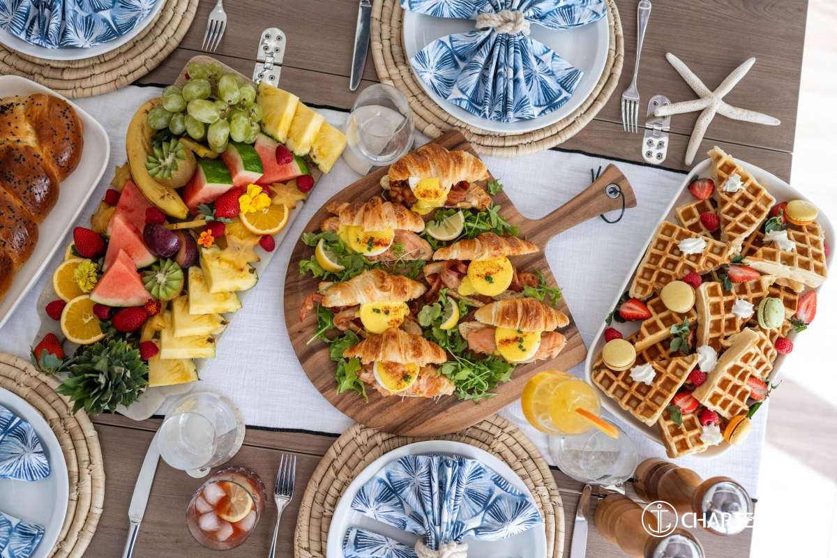 LOCAL FARE: Includes: 7 breakfasts, 5 lunches & 5 dinners. Requires 2 lunches and 2 dinners ashore at client expense. -For local fare, deduct $150 per person off the charter rate